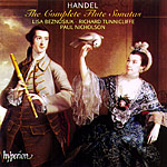 While there is no mention of it here, seven out of the eight sonatas performed on this program originally were recorded and issued in 1995 as part of a now long-deleted three-CD Hyperion boxed set (66921/3) that contained all of Handel’s Op. 1 sonatas. The final selection on this new CD, the recently discovered (or “attributed”, as is the case to some extent with nearly all of these sonatas) Sonata in D major, was recorded last January. When that earlier set was released, it was a refreshing alternative to the only other complete Op. 1 traversal available at the time: the staid, often prissy account by L’Ecole d’Orphee on CRD. Anyway, back then I enjoyed how veteran original-instrument flutist Lisa Beznosuik’s interpretations provided a stunning “light” contrast to my longstanding favorite “dark” interpretation–Frans Brüggen’s revelatory 1974 Seon cycle, which was not yet available on CD at the time. (In 1998 Sony finally did release the Brüggen cycle, though unfortunately only in Europe).