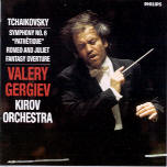 Valery Gergiev and the Kirov Orchestra emphasize the dark and dramatic side of Tchaikovsky in this stunning new recording of the Pathetique. The long-held pauses in the opening portend the gravity of what is to follow. The orchestra’s dark colors are fully fleshed out (enhanced by the recording’s somewhat dry acoustic and slightly over- reverberant bass) in the rich low-string writing that permeates this symphony. The low brass–trombones in particular–are given star billing in the dramatic climaxes, especially the heart-rending tragedy of the first movement. However, the interpretation is not all wild histrionics. Gergiev maintains a sure sense of balance and structural integrity, drawing from within the music, not imposing upon it as many Western conductors so often do. Add to this a rubato that breathes naturally in accordance with the emotional character of each passage (especially evident in the finale, where the phrases are wonderfully sculpted and the climax feels inevitable), and you have a Pathetique that joins Mravinksy and Muti (Philharmonia) as one of the greats. Romeo and Juliet shares many of these same qualities. The allegros sound wonderfully impetuous and urgent, even if they’re not rendered with that final degree of unbridled passion that Bernstein provides. A fine conclusion to a fabulous disc.