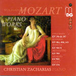 Christian Zacharias recorded all the Mozart piano sonatas for EMI. The hit and miss quality of that undertaking extends as well to his first solo outing for MDG. Zacharias’ fluent fingers are refined to a fault. Dynamic gradations, for instance, have an overly worked out quality to them, offering little surprise to listeners. The pianist often pulls back at climactic moments, such as the pedal point toward the end of the amazing Eine Kleine Gigue, or the harmonic sleights of hand in the sublime B minor Adagio. Conversely, Zacharias serves up the C minor Fantasy K. 396 in a perverse, detached manner that evokes Glennn Gould’s ghost, with brutal trills that perhaps are better suited to Prokofiev. The A minor Rondo, however, gets a stylish, not overly intense reading, but the grounded, concentrated C minor Fantasy (K. 475) shows what Zacharias can really do in this repertoire. Incidentally, the controversial 10 measures normally tacked onto the end of the D minor Fantasy K. 397 are omitted in this collection.