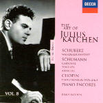 Volume 8 in Australian Decca’s Julius Katchen series offers rare solo recordings from the 1950s and ’60s. Most of these are new to CD and considerably flesh out what we know of the short-lived pianist’s artistry beyond his acclaimed solo Brahms cycle. He rides the gnarly technical hurdles of Schubert’s Wanderer Fantasie without a trace of compromise. He doesn’t slam down the brakes to accommodate the opening movement’s octave scales, and likewise keeps the second movement “Wanderer” theme afloat by not mooning over the right hand filigree. Rhetorical touches in the finale, however, distract more than they illuminate, and ditto for the pianist’s Schumann Arabesque. Katchen’s extroverted side is blown up to IMAX proportions in the Schumann Carnaval. It’s packed to the rafters with surreal rubatos, wacky inner voices, and fast movements fueled with extra caffeine. As if that weren’t enough, Katchen plays the forbidden “Sphinxes”, dolling up the cryptic notes with tremolos à la Rachmaninov. It’s the most insane Carnaval I’ve ever heard, and I love every bar of it!