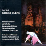 Kurt Weill regarded this work highly, predicting it would be remembered as his masterpiece. It is a difficult work to peg; is it opera with some spoken dialogue, or Broadway with a large amount of musical underscore and mood music? Perhaps the answer simply lies in the term “Musical Theater”. The fact is that its subject, a day in the life of a poor New York neighborhood, portrays a truly “American” experience, written by a knowing tourist who loaded the work with wonderful drama and good music. The musical/opera is hard to cast, for it takes a very large number of performers, all of whom must be capable singing actors. It seems amazing then, that both successful full-length recordings of Street Scene were done at almost the same time, without duplicating any cast members. Though John Mauceri’s Decca recording is good, I think that this Jay CD has a casting edge. Kristine Ciesinski makes a magnificent Anna. Her singing of “A Boy Like You” is womanly and motherly, whereas that of Josephine Barstow on Decca is matronly, more like a grandmother. Richard Van Allan, as Anna’s suspicious husband, is dark and brooding, much more menacing than Decca’s Samuel Ramey. And Bonaventura Bottone, as Sam, makes “Lonely Town” a more fluid and memorable experience than the competition’s Jerry Hadley, who sounds self-conscious and patronizing. Jay’s Carl Davis weilds a slightly more incisive baton than Mauceri, and his chorus enunicates more clearly.