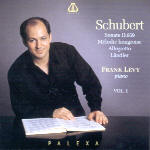 Recorded in concert in the bright acoustic of the Chapelle historique du Bon-Pasteur in Montréal, Canada, this fine Schubertian program presents Swiss pianist Frank Lévy in a very appealing if inconsistent light. The performances are lovingly outlined, sensitive, detailed, and sincere, but they too often stop the natural flow of the music. Either by overabundance of interpretive intentions or as a result of nervousness due to the live recordings, Lévy’s playing sometimes goes slightly over the edge, capriciously changing tempo within a single phrase or adding unnecessary accents. Furthermore, his technique is secure but not always perfectly clean, occasioning a few minor accidents or unbalanced chords in the course of the recital. The big A major Sonata sounds more like a collection of nice impressionistic moments rather than a vast architecture of epic proportion and content. The Hungarian Melody similarly lacks coherence, while the Allegretto in C minor, taken at a ceremonious pace, favors gravity above tender melancholy.