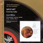 In essence, EMI’s 20-bit remastering of Karl Böhm’s 1962 Così fan tutte fortifies the lower strings, winds, and timpani, while sharpening note attacks and word endings. By contrast, the label’s 1988 CD transfer is equalized more evenly from top to bottom. The close-up, slightly dry sonics underline Böhm’s tightly-knit, forthright, and sober conception. He opens many of the recitative cuts made in Karajan’s earlier Philharmonia Così, while presiding over a strong cast. Elisabeth Schwarzkopf’s silvery Fiordiligi didn’t age at all since the Karajan recording, but here she enacts the text to a more precious degree. Christa Ludwig’s darker voice and more direct musicianship, though, make a desert island Dorabella. As Ferrando, Alfredo Kraus’ hefty, ringing tenor will appeal to tastes other than mine (I greatly prefer Karajan’s Leopold Simoneau, one of the most elegant stylists to undertake this part). But how Giuseppi Taddei wraps his beguiling, idiomatic, and alert pipes around Guglielmo’s music! The unusual clarity and precision of the chorus merits special distinction too. All in all, Böhm’s Così, among traditional (that is, non-period instrument) recordings, safely holds its long-time benchmark position. Excellent, frank notes, plus full texts and translations are included.