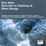 What Eric Moe offers on this disc is a pair of attractive, well-wrought song cycles that treat the voice as the melodic instrument it is. Siren Songs is a piece in the tradition of Samuel Barber’s Hermit Songs or Copland’s Emily Dickinson settings, but with the bite and rhythmic sense of John Adams. There are glowing melodies (“In the Hour Before Dawn”) and quirky settings (“Eyewitness Account”) where the text is spoken in rhythm–which isn’t a cop-out because the accompaniment is so charming, the declamation so forthright and clever. The composer himself is at the keyboard, and he plays in a clipped, precise way. It would be interesting to hear a warmer, rounder interperetation, more for the sake of hearing it differently than wanting better.